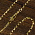 アズキチェーンとロールチェーンの中間のような滑らかな曲線が持ち味の、ゴールドの重みを感じるチェーンです。適度なふくらみで肌あたりもよく、どんなスタイルにも相性の良いデザイン。