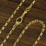 アズキチェーンとロールチェーンの中間のような滑らかな曲線が持ち味の、ゴールドの重みを感じるチェーンです。適度なふくらみで肌あたりもよく、どんなスタイルにも相性の良いデザイン。表面に施したカットに反射する光がワンランク上の質感を放ち、スタイリッシュな六角形の留め具がポイントになっています。
