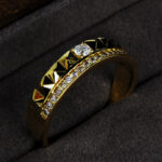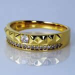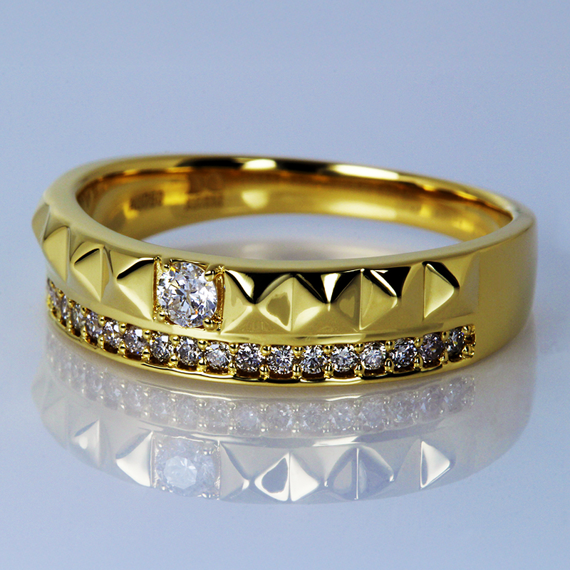 鋲モチーフがロックな印象のメンズリング 指輪 。ライン状に並べたダイヤモンドは、地金に埋め込むように留めてあり、衝撃による石取れリスクを軽減しています。程よく幅広で、ボリューム感は残しつつも太すぎず、指の曲げ伸ばしにストレスがない重量に仕上げました。